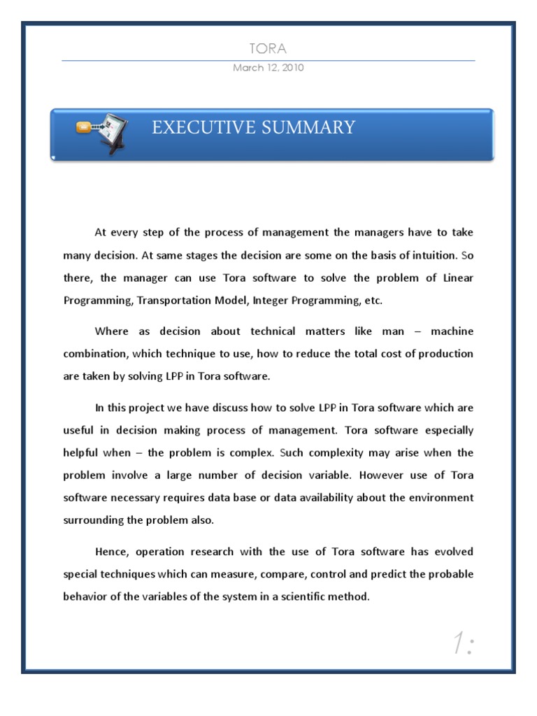 At every step of the process of management the managers have to take many decision. At same stages the decision are some on the basis of intuition. So there, the manager can use Tora software to solve the problem of Linear Programming, Transportation Model, Integer Programming, etc. Where as decision about technical matters like man machine combination, which technique to use, how to reduce the total cost of production are taken by solving LPP in Tora software. In this project we have discuss how to solve LPP in Tora software which are useful in decision making process of management. Tora software especially helpful when the problem is complex. Such complexity may arise when the problem involve a large number of decision variable. However use of Tora software necessary requires data base or data availability about the environment surrounding the problem also. Hence, operation research with the use of Tora software has evolved special techniques which can measure, compare, control and predict the probable behavior of the variables of the system in a scientific method.