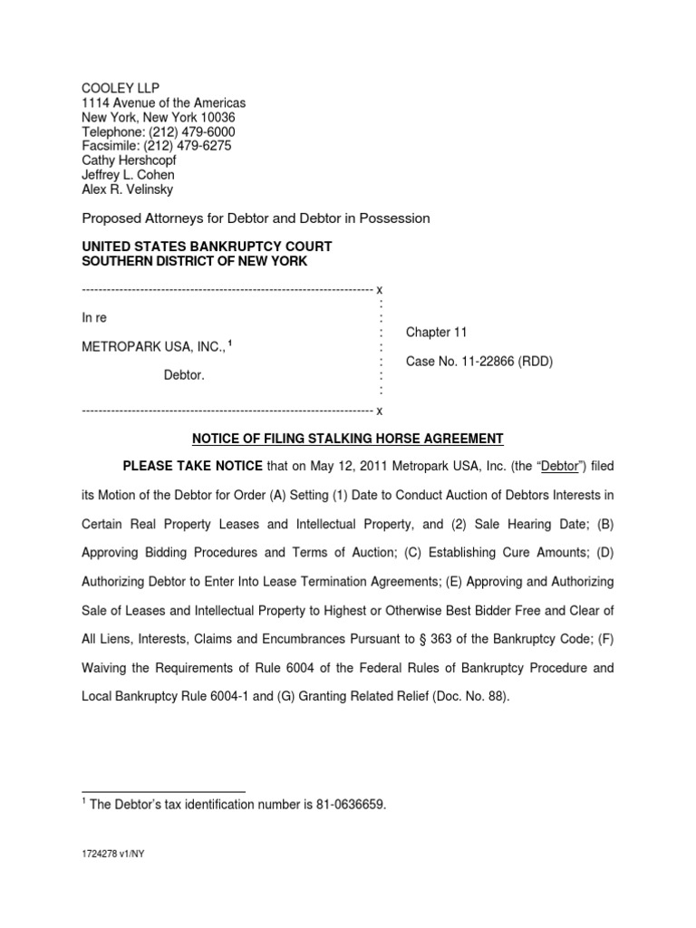 UNITED STATES BANKRUPTCY COURT SOUTHERN DISTRICT OF NEW YORK ---------------------------------------------------------------------- x : : In re : : METROPARK USA, INC., 1 : : Debtor. : ---------------------------------------------------------------------- x NOTICE OF FILING STALKING HORSE AGREEMENT PLEASE TAKE NOTICE that on May 12, 2011 Metropark USA, Inc. (the Debtor) filed its Motion of the Debtor for Order (A) Setting (1) Date to Conduct Auction of Debtors Interests in Certain Real Property Leases and Intellectual Property, and (2) Sale Hearing Date; (B) Approving Bidding Procedures and Terms of Auction; (C) Establishing Cure Amounts; (D) Authorizing Debtor to Enter Into Lease Termination Agreements; (E) Approving and Authorizing Sale of Leases and Intellectual Property to Highest or Otherwise Best Bidder Free and Clear of All Liens, Interests, Claims and Encumbrances Pursuant to 363 of the Bankruptcy Code; (F) Waiving the Requirements of Rule 6004 of the Federal Rules of Bankruptcy Procedure and Local Bankruptcy Rule 6004-1 and (G) Granting Related Relief (Doc. No. 88).
