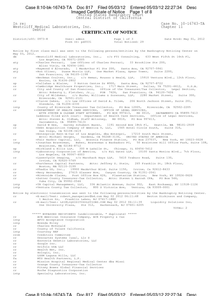 Notice by first class mail was sent to the following persons/entities by the Bankruptcy Noticing Center on May 03, 2012. db +Westcliff Medical Laboratories, Inc., c/o FTI Consulting, 633 West Fifth St 16th Fl, Los Angeles, CA 90071-2005 aty +Charles Ferrari, Law Offices of Charles Ferrari, 33 Brookline Ste 200, Aliso Viejo, CA 92656-1461 aty +Raymond G Alvarado, 1 MacArthur Pl Ste 200, Santa Ana, CA 92707-5941 aty +Ron Oliner, Duane Morris LLP, One Market Plaza, Spear Tower, Suite 2200, San Francisco, CA 94105-1198 cr +Beckman Coulter, Inc., c/o Hemar, Rousso & Heald, LLP, 15910 Ventura Blvd., 12th Floor, Encino, CA 91436-2802 sp +Callahan & Blaine, 3 Hutton Centre Dr #900, Santa Ana, CA 92707-8722 cr +Cambridge Healthcare Properties, Inc., 1717 Main Street, Dallas, TX 75201-4612, U.S.A. cr City and County of San Francisco, Office of the Treasurer/Tax Collector, Legal Section, Attn: Robertg L. Fletcher, Jr.,, POB 7426, San Francisco, CA 94120-7426 cr City of Wildomar, c/o Burke, Williams & Sorensen, LLP, 2280 Market Street, Suite 300, Riverside, CA 92501-2121 cr +Claire Oakes, c/o Law Offices of David A. Tilem, 206 North Jackson Street, Suite 201, Glendale, CA 91206-4330 intp County of Riverside Treasurer Tax Collector, PO Box 12005, Riverside, CA 92502-2205 cr ++DEPARTMENT OF HEALTH CARE SERVICES, OFFICE OF LEGAL SERVICES, ATTN STEVEN A OLDHAM STAFF ATTORNEY, PO BOX 997413, MS 0010, SACRAMENTO CA 95899-7413 (address filed with court: Department of Health Care Services, Office of Legal Services, Attn: Steven A. Oldham, Staff Attorney, MS 0010, PO Box 997413, Sacramento, CA 95899-7413) op David W Gee, Garvey Schubert Barer, 1191 Second Ave 18th Fl, Seattle, WA 98101-2939 cr +Debt Acquisition Company of America V, LLC, 1565 Hotel Circle South, Suite 310, San Diego, CA 92108-3419 cr +Enterprise Rent-A-Car of Los Angeles, dba Enterpri, 17210 South Main Street, Attn: Michael Gerges, Gardena, CA 90248-3130, UNITED STATES OF AMERICA cr +Fair Harbor Capital, LLC, Ansonia Finance Station, PO Box 237037, New York, NY 10023-0028 intp +Jonathan Braverman, Baker, Braverman & Barbadoro PC, 50 Braintree Hill Office Park, Suite 108, Braintree, MA 02184-8712 sp +Kirkland & Ellis LLP, 300 N LaSalle St, Chicago, IL 60654-5412 intp +Laboratory Corporation of America, c/o K&L Gates LLP, 10100 Santa Monica Blvd., 7th Floor, Los Angeles, CA 90067-4003 cr +LaserCycle Imaging, c/o Marshack Hays LLP, 5410 Trabuco Road, Suite 130, Irvine, CA 92620-5749 cr +Parthenon Capital Partners, Attn: Jeffrey S. Stein, 265 Franklin St, 18th Floor, Boston, MA 02110-3199 cr +Phadia US, Inc., 19900 MacArthur Blvd. Suite 1150, Irvine, Ca 92612-8433 cr +Recy Hernandez, 27615 Glasser Ave, Canyon Country, CA 91351-2041 cr +Riverside Claims, Post Office Box 626, Planetarium Station, New York, NY 10024-0626 cr +Sutter County Treasurer-Tax Collector, Attn: Steven L Harrah CPA, PO Box 546, Yuba City, CA 95992-0546 intp +TR Capital Management, LLC, 336 Atlantic Avenue, Suite 302, East Rockaway, NY 11518-1124 intp +Ventura County Tax Collector, 800 S Victoria Ave, Ventura, CA 93009-0001 Notice by electronic transmission was sent to the following persons/entities by the Bankruptcy Noticing Center. cr +E-mail/Text: robert_manspeizer@bd.com May 02 2012 06:11:48 Becton Dickinson and Company, 1 Becton Dr, Franklin Lakes, NJ 07417-1880 cr +E-mail/Text: LSI@LIQUIDITYSOLUTIONS.COM May 02 2012 06:11:39 Liquidity Solutions Inc, One University Plaza, Ste 312, Hackensack, NJ 07601-6205 TOTAL: 2 cr intp intp cr cr intp crcm cr cr cr cr cr cr cr fa cr cr cr cr intp ***** BYPASSED RECIPIENTS (undeliverable, * duplicate) ***** ACE American Insurance Company, ACE Property & Cas AFCO Acceptance Corporation Brenda Riley Charles McDonald County of Tulare California Courtesy NEF Creditors Committee Descartes Systems [usa], Llc D Esoterix Genetic Laboratories, LLC Google Inc. Grifols USA LLC Health Net, Inc. Hologic, Inc. LGSM Laguna Hills, LLC MTS Health Partners, L.P. Mission Hospital Regional Medical Center dba Missi Orange County Treasurer-Tax Collector Pitney Bowes Global Financial Services Roche Diagnostics Corporation Specialty Laboratories, Inc.