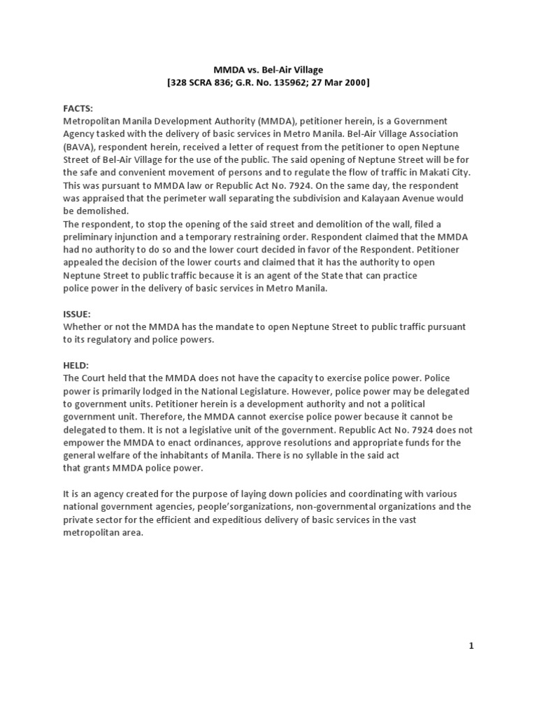 135962; 27 Mar 2000] FACTS: Metropolitan Manila Development Authority (MMDA), petitioner herein, is a Government Agency tasked with the delivery of basic services in Metro Manila. Bel-Air Village Association (BAVA), respondent herein, received a letter of request from the petitioner to open Neptune Street of Bel-Air Village for the use of the public. The said opening of Neptune Street will be for the safe and convenient movement of persons and to regulate the flow of traffic in Makati City. This was pursuant to MMDA law or Republic Act No. 7924. On the same day, the respondent was appraised that the perimeter wall separating the subdivision and Kalayaan Avenue would be demolished. The respondent, to stop the opening of the said street and demolition of the wall, filed a preliminary injunction and a temporary restraining order. Respondent claimed that the MMDA had no authority to do so and the lower court decided in favor of the Respondent. Petitioner appealed the decision of the lower courts and claimed that it has the authority to open Neptune Street to public traffic because it is an agent of the State that can practice police power in the delivery of basic services in Metro Manila. ISSUE: Whether or not the MMDA has the mandate to open Neptune Street to public traffic pursuant to its regulatory and police powers. HELD: The Court held that the MMDA does not have the capacity to exercise police power. Police power is primarily lodged in the National Legislature. However, police power may be delegated to government units. Petitioner herein is a development authority and not a political government unit. Therefore, the MMDA cannot exercise police power because it cannot be delegated to them. It is not a legislative unit of the government. Republic Act No. 7924 does not empower the MMDA to enact ordinances, approve resolutions and appropriate funds for the general welfare of the inhabitants of Manila. There is no syllable in the said act that grants MMDA police power. It is an agency created for the purpose of laying down policies and coordinating with various national government agencies, peoplesorganizations, non-governmental organizations and the private sector for the efficient and expeditious delivery of basic services in the vast metropolitan area.