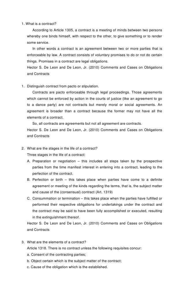 According to Article 1305, a contract is a meeting of minds between two persons whereby one binds himself, with respect to the other, to give something or to render some service. In other words a contract is an agreement between two or more parties that is enforceable by law. A contract consists of voluntary promises to do or not do certain things. Promises in a contract are legal obligations. Hector S. De Leon and De Leon, Jr. (2010) Comments and Cases on Obligations and Contracts