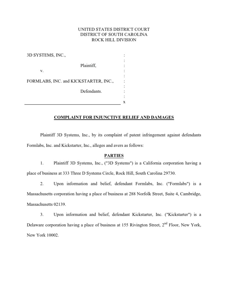 least Formlabs' and Kickstarter's website sales activities of regularly soliciting and conducting sales activities within South Carolina and this judicial district. 6. and 1400(b). BACKGROUND FACTS 7. 3D Systems is a global company that has developed technology in additive Venue is proper in this judicial district under 28 U.S.C. 1391(b), 1391(c),