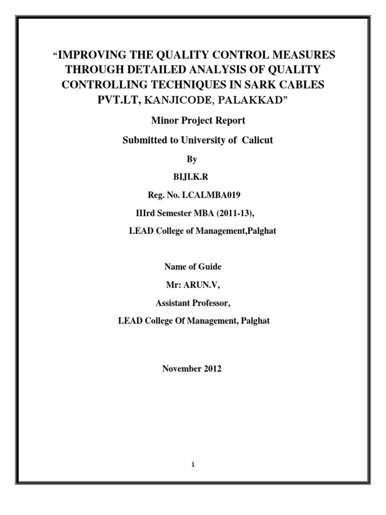 This is to certify that the record of Project Report IMPROVING THE QUALITY CONTROL MEASURES THROUGH DETAILED ANALYSIS OF QUALITY CONTROLLING TECHNIQUES IN SARK CABLES PVT.LTD, KANJICODE, PALAKKAD submitted by BIJI.K.R is a bonafide work carried out by her in partial fulfillment of the Master of Business Administration during the year 2011-2013