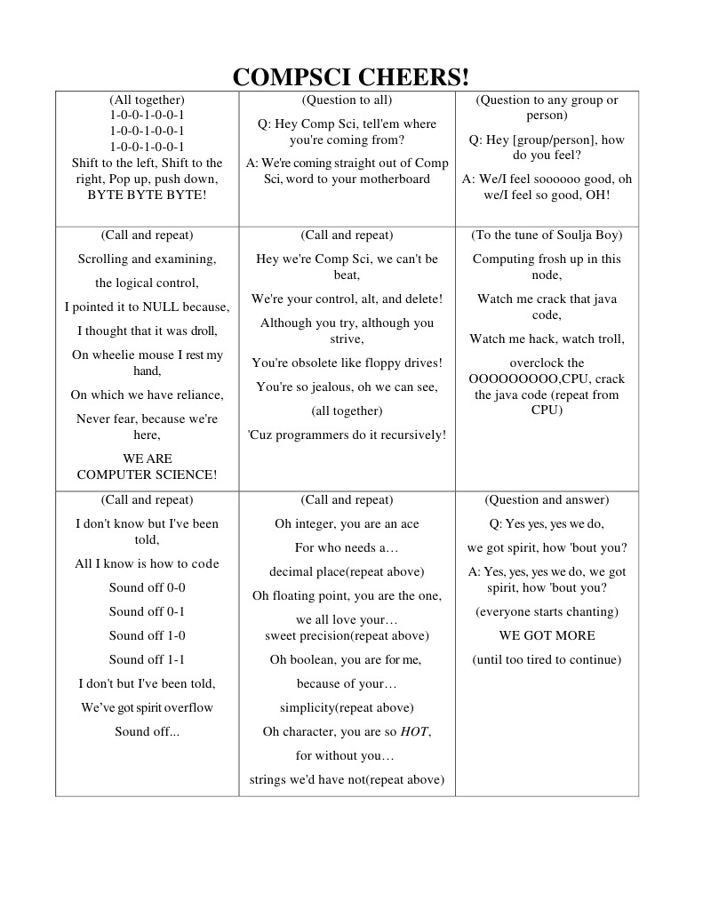 (All together) 1-0-0-1-0-0-1 1-0-0-1-0-0-1 1-0-0-1-0-0-1 Shift to the left, Shift to the right, Pop up, push down, BYTE BYTE BYTE! (Call and repeat) Scrolling and examining, the logical control, I pointed it to NULL because, I thought that it was droll, On wheelie mouse I rest my hand, On which we have reliance, Never fear, because we're here, WE ARE COMPUTER SCIENCE! (Call and repeat) I don't know but I've been told, All I know is how to code Sound off 0-0 Sound off 0-1 Sound off 1-0 Sound off 1-1 I don't but I've been told, Weve got spirit overflow Sound off... (Call and repeat) Oh integer, you are an ace For who needs a decimal place(repeat above) Oh floating point, you are the one, we all love your sweet precision(repeat above) Oh boolean, you are for me, because of your simplicity(repeat above) Oh character, you are so HOT, for without you strings we'd have not(repeat above) (Question and answer) Q: Yes yes, yes we do, we got spirit, how 'bout you? A: Yes, yes, yes we do, we got spirit, how 'bout you? (everyone starts chanting) WE GOT MORE (until too tired to continue) (Question to all) Q: Hey Comp Sci, tell'em where you're coming from? (Question to any group or person) Q: Hey [group/person], how do you feel?