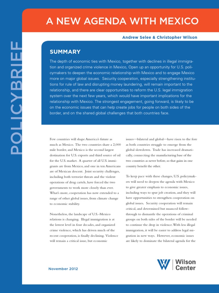 Few countries will shape America’s future as much as Mexico. The two countries share a 2,000 mile border, and Mexico is the second largest destination for U.S. exports and third source of oil for the U.S. market. A quarter of all U.S. immi-grants are from Mexico, and one in ten Americans are of Mexican descent. Joint security challenges, including both terrorist threats and the violent operations of drug cartels, have forced the two governments to work more closely than ever. What’s more, cooperation has now extended to a range of other global issues, from climate change to economic stability.Nonetheless, the landscape of U.S.-Mexico relations is changing. Illegal immigration is at the lowest level in four decades, and organized crime violence, which has driven much of the recent cooperation, is finally declining. Violence will remain a critical issue, but economic issues—bilateral and global—have risen to the fore as both countries struggle to emerge from the global slowdown. Trade has increased dramati-cally, connecting the manufacturing base of the two countries as never before, so that gains in one country benefit the other.To keep pace with these changes, U.S. policymak-ers will need to deepen the agenda with Mexico to give greater emphasis to economic issues, including ways to spur job creation, and they will have opportunities to strengthen cooperation on global issues