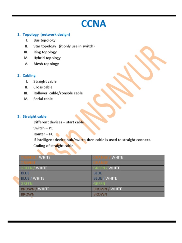 1. Topology (network design) I. Bus topology II. Star topology (it only use in switch) III. Ring topology IV. Hybrid topology V. Mesh topology 2. Cabling I. Straight cable II. Cross cable III. Rollover cable/console cable IV. Serial cable
