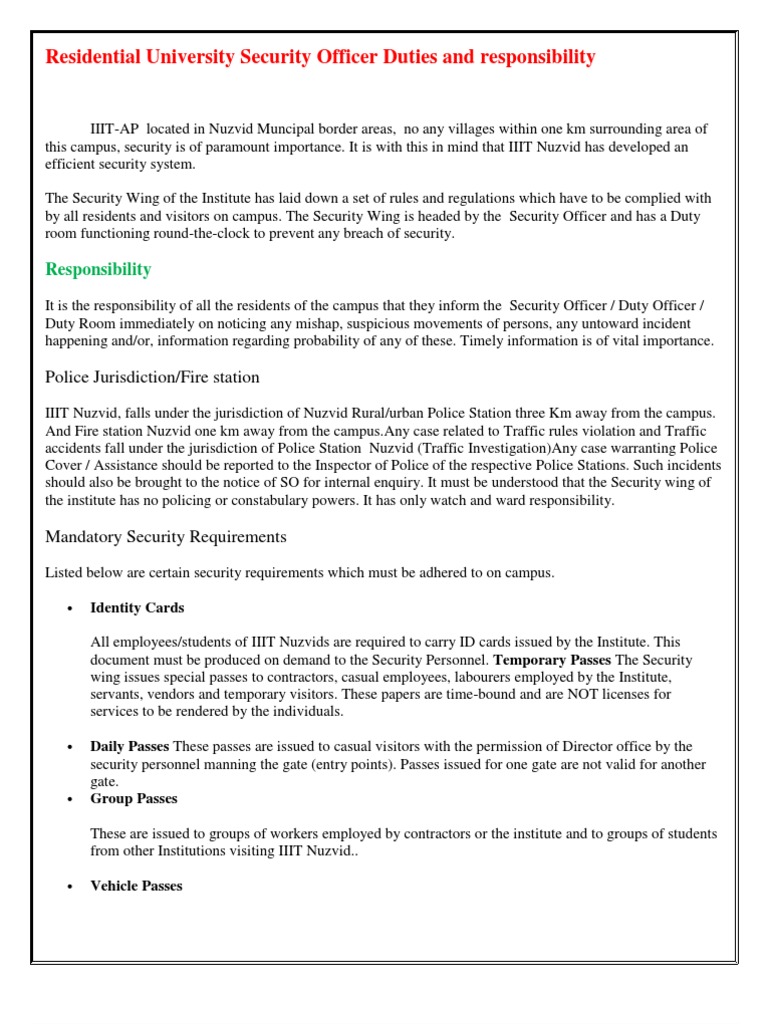 Residential University Security Officer Duties and responsibility