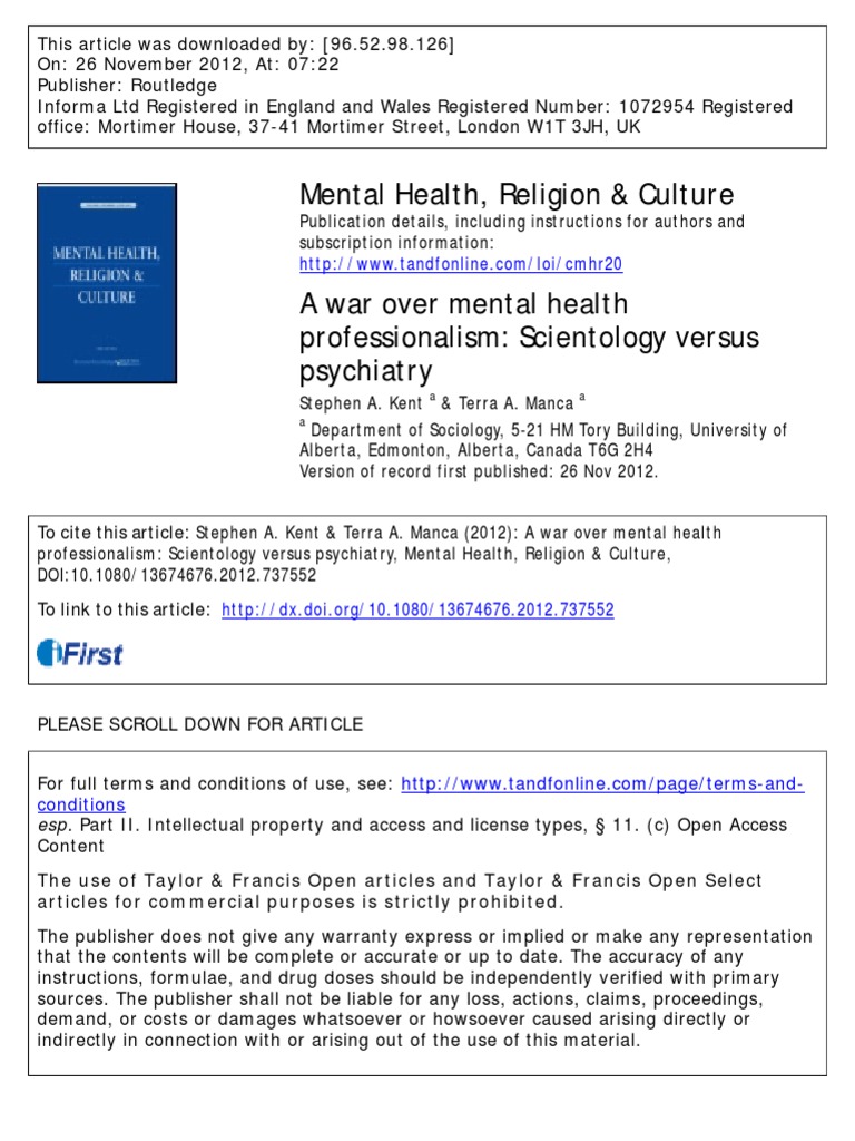 Stephen A. Kent & Terra A. Manca (2012): A war over mental healthprofessionalism: Scientology versus psychiatry, Mental Health, Religion & Culture,DOI:10.1080/13674676.2012.737552