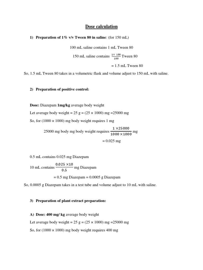 Dose Calculation: 1) Preparation of 1% V/V Tween 80 in Saline: (For 150 ML)