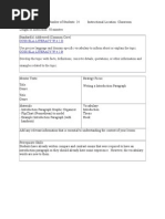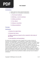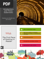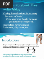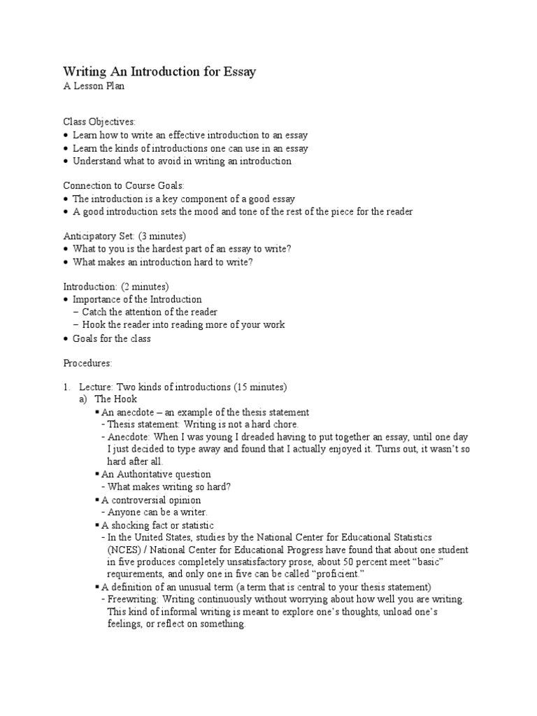 A Lesson Plan Class Objectives: Learn how to write an effective introduction to an essay Learn the kinds of introductions one can use in an essay Understand what to avoid in writing an introduction Connection to Course Goals: The introduction is a key component of a good essay A good introduction sets the mood and tone of the rest of the piece for the reader Anticipatory Set: (3 minutes) What to you is the hardest part of an essay to write? What makes an introduction hard to write? Introduction: (2 minutes) Importance of the Introduction Catch the attention of the reader Hook the reader into reading more of your work Goals for the class Procedures: 1. Lecture: Two kinds of introductions (15 minutes) a) The Hook An anecdote an example of the thesis statement - Thesis statement: Writing is not a hard chore. - Anecdote: When I was young I dreaded having to put together an essay, until one day I just decided to type away and found that I actually enjoyed it. Turns out, it wasnt so hard after all. An Authoritative question - What makes writing so hard? A controversial opinion - Anyone can be a writer. A shocking fact or statistic - In the United States, studies by the National Center for Educational Statistics (NCES) / National Center for Educational Progress have found that about one student in five produces completely unsatisfactory prose, about 50 percent meet basic requirements, and only one in five can be called proficient. A definition of an unusual term (a term that is central to your thesis statement) - Freewriting: Writing continuously without worrying about how well you are writing. This kind of informal writing is meant to explore ones thoughts, unload ones feelings, or reflect on something.