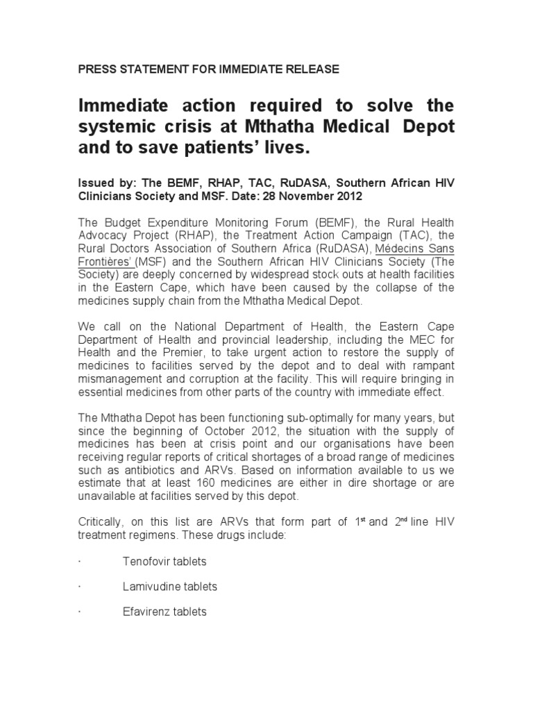 At least 160 medicines are either in dire shortage or are unavailable at facilities served by the Mthatha Medical Depot. The unavailability of these medicines is having and will continue to have severe consequences for patients on ART. This will result in many developing resistance to their current treatment and others becoming increasingly ill.
