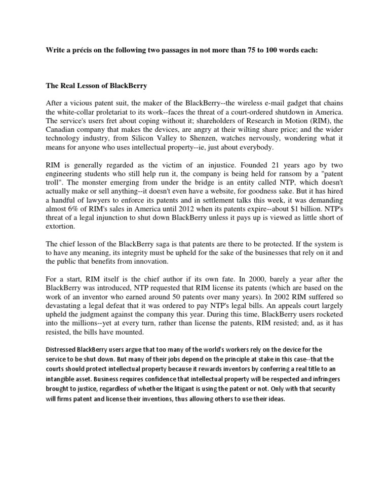 Write a prcis on the following two passages in not more than 75 to 100 words each: