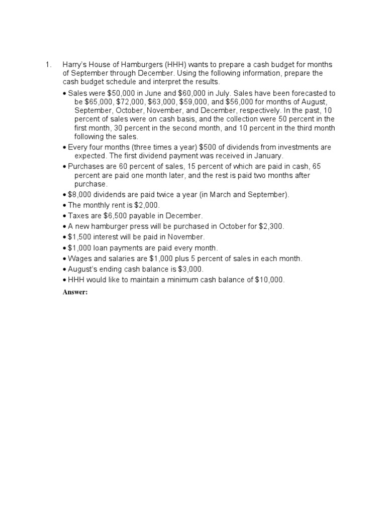 Harrys House of Hamburgers (HHH) wants to prepare a cash budget for months of September through December. Using the following information, prepare the cash budget schedule and interpret the results. Sales were $50,000 in June and $60,000 in July. Sales have been forecasted to be $65,000, $72,000, $63,000, $59,000, and $56,000 for months of August, September, October, November, and December, respectively. In the past, 10 percent of sales were on cash basis, and the collection were 50 percent in the first month, 30 percent in the second month, and 10 percent in the third month following the sales. Every four months (three times a year) $500 of dividends from investments are expected. The first dividend payment was received in January. Purchases are 60 percent of sales, 15 percent of which are paid in cash, 65 percent are paid one month later, and the rest is paid two months after purchase. $8,000 dividends are paid twice a year (in March and September). The monthly rent is $2,000. Taxes are $6,500 payable in December. A new hamburger press will be purchased in October for $2,300. $1,500 interest will be paid in November. $1,000 loan payments are paid every month. Wages and salaries are $1,000 plus 5 percent of sales in each month. Augusts ending cash balance is $3,000. HHH would like to maintain a minimum cash balance of $10,000.