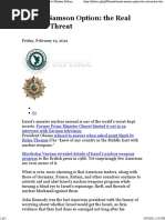 Bulletin of Atomic Scientists Review of Book ([Link] pg=PA41&dq=samson+option&ei=Z6klSpWkKZLqyATIvpmzBw#PPA42,M1) David Hirst, The War Game, a controversial view of the current crisis in the Middle East ([Link] [Link]/comment/story/0,6903,1046411,[Link]), The Observer Guardian, September 21, 2003. H. Brown, Column item on Samson Option ([Link] watch_ch_5_3_02.htm), San Francisco Call ([Link] May 3, 2002. John Steinbach, Israeli Weapons of Mass Destruction, A Threat to Peace: Israel's Nuclear Arsenal ([Link] [Link]/[Link]?context=va&aid=4365) [Link] ([Link] March 2002. Ross Dunn, Sharon eyes 'Samson option' against Iraq ([Link] cfm?id=1223502002), [Link] news ([Link] November 3, 2002. Ross Dunn, In war, Israel retains the Samson option ([Link] [Link]), Sydney Morning Herald ([Link] September 20, 2002. Hal Lindsey, The Samson Option ([Link] cfm?articleid=28932&website=[Link]), [Link] ([Link] Org), July 14, 2007. Louis Ren Beres, Israel and Samson. Biblical Insights on Israeli Strategy in the Nuclear Age ([Link] [Link]/eng/[Link]?article_id=101&id=15), [Link] ([Link] [Link]/). Strategic Doctrine (of Israel) ([Link] Federation of American Scientists ([Link]