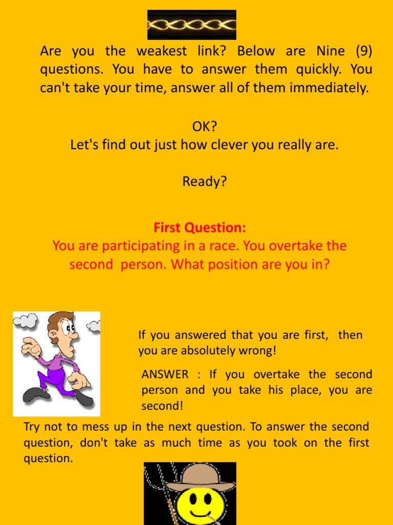 You can't take your time, answer all of them immediately. OK? Let's find out just how clever you really are. Ready? First Question: You are participating in a race. You overtake the second person. What position are you in?