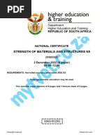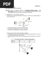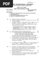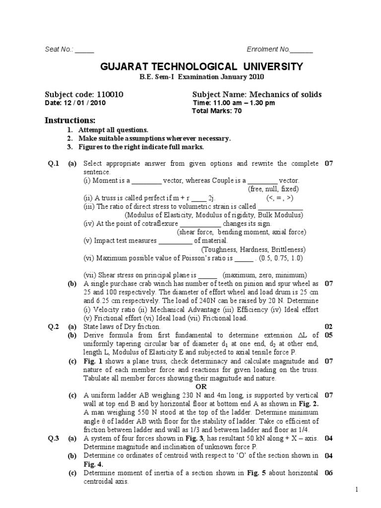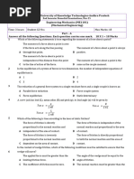 1. Attempt all questions. 2. Make suitable assumptions wherever necessary. 3. Figures to the right indicate full marks. Q.1 (a) Select appropriate answer from given options and rewrite the complete 07 sentence. (i) Moment is a ________ vector, whereas Couple is a ________ vector. (free, null, fixed) (ii) A truss is called perfect if m + r ____ 2j. (<, = , >) (iii) The ratio of direct stress to volumetric strain is called ____________ (Modulus of Elasticity, Modulus of rigidity, Bulk Modulus) (iv) At the point of cotraflexure ___________ changes its sign. (shear force, bending moment, axial force) (v) Impact test measures _________ of material. (Toughness, Hardness, Brittleness) (vi) Maximum possible value of Poissons ratio is _____ . (0.5, 0.75, 1.0) (vii) Shear stress on principal plane is _____ (maximum, zero, minimum) (b) A single purchase crab winch has number of teeth on pinion and spur wheel as 25 and 100 respectively. The diameter of effort wheel and load drum is 25 cm and 6.25 cm respectively. The load of 240N can be raised by 20 N. Determine (i) Velocity ratio (ii) Mechanical Advantage (iii) Efficiency (iv) Ideal effort (v) Frictional effort (vi) Ideal load (vii) Frictional load. (a) State laws of Dry friction. (b) Derive formula from first fundamental to determine extension L of uniformly tapering circular bar of diameter d1 at one end, d2 at other end, length L, Modulus of Elasticity E and subjected to axial tensile force P. (c) Fig. 1 shows a plane truss, check determinacy and calculate magnitude and nature of each member force and reactions for given loading on the truss. Tabulate all member forces showing their magnitude and nature. OR (c) A uniform ladder AB weighing 230 N and 4m long, is supported by vertical wall at top end B and by horizontal floor at bottom end A as shown in Fig. 2. A man weighing 550 N stood at the top of the ladder. Determine minimum angle of ladder AB with floor for the stability of ladder. Take co efficient of friction between ladder and wall as 1/3 and between ladder and floor as 1/4. (a) A system of four forces shown in Fig. 3, has resultant 50 kN along + X axis. Determine magnitude and inclination of unknown force P. Determine co ordinates of centroid with respect to O of the section shown in (b) Fig. 4. (c) Determine moment of inertia of a section shown in Fig. 5 about horizontal centroidal axis.