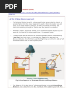 es the objects on the earth in an arbitrary way, unaffected by anything, until it reaches the final striking distance, a general method can be derived which allows the volume to be protected of any arrangement to be inspected. Carrying out the rolling sphere method requires a scale model (e. g. on a scale of 1:100) of the building/structure to be protected, which includes the external contours and, where applicable, the air-termination systems. Depending on the location of the object under investigation, it is also necessary to include the surrounding structures and objects, since these could act as a natural protective measure for the object under examination. Furthermore, a true-to-scale sphere is required according to the type of lightning protection system with a radius corresponding to the final striking distance (depending on the type of lightning protection system, the radius R of the rolling sphere must correspond true-to-scale to the radii 20, 30, 45 or 60 m). The centre of the rolling sphere used corresponds to the head of the downward leader formed by the respective upward leader. The rolling sphere is now rolled around the object under examination and the contact points representing potential points of strike are marked in each case. The rolling sphere is then rolled over the object in all directions. All contact points are marked again. All potential points of strike are thus shown on the model; it is also possible to determine the areas which can be hit by lateral strokes. The naturally protected zones resulting from the geometry of the object to be protected and its surroundings can also be clearly seen. Air-termination conductors are not required at these points (Fig. 5.1.1.3). It must be borne in mind, however, that lightning footprints have also been found on steeples in places not directly touched as the rolling sphere rolled over. This is traced to the fact that, Radius of the rolling Min. peak sphere (final striking value of current distance hB) R in m I in kA 60 45 30 20 15.7 10.1 5.4 2.9