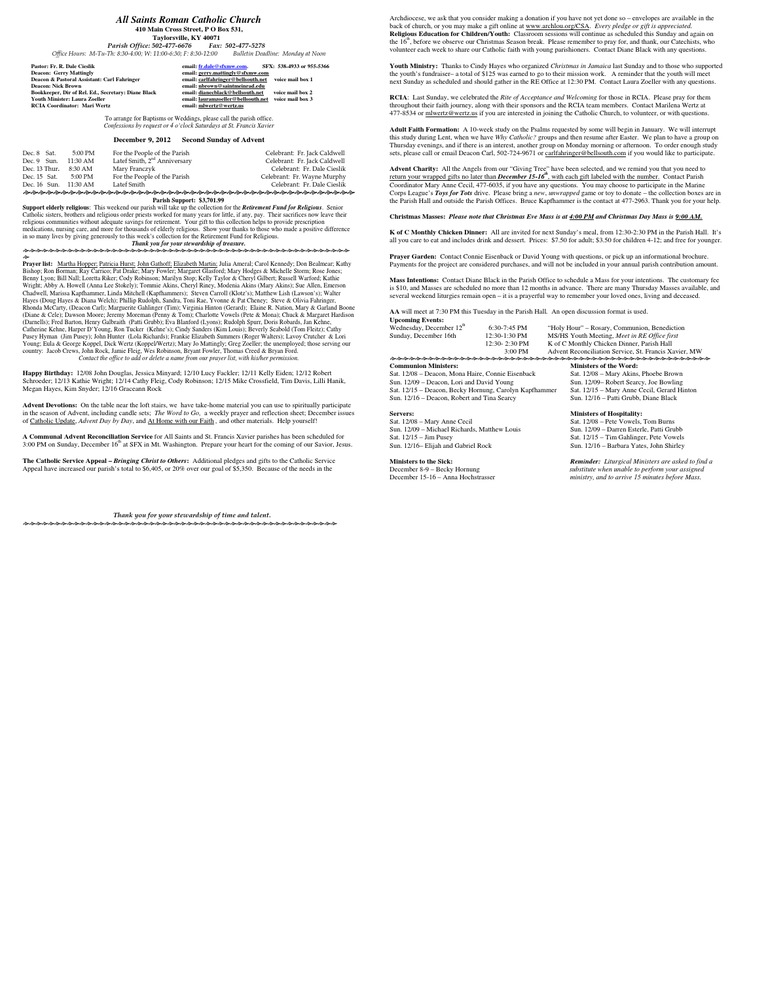 Happy Birthday: 12/08 John Douglas, Jessica Minyard; 12/10 Lucy Fackler; 12/11 Kelly Eiden; 12/12 Robert Schroeder; 12/13 Kathie Wright; 12/14 Cathy Fleig, Cody Robinson; 12/15 Mike Crossfield, Tim Davis, Lilli Hanik, Megan Hayes, Kim Snyder; 12/16 Graceann Rock Advent Devotions: On the table near the loft stairs, we have take-home material you can use to spiritually participate in the season of Advent, including candle sets; The Word to Go, a weekly prayer and reflection sheet; December issues of Catholic Update, Advent Day by Day, and At Home with our Faith , and other materials. Help yourself! A Communal Advent Reconciliation Service for All Saints and St. Francis Xavier parishes has been scheduled for th 3:00 PM on Sunday, December 16 at SFX in Mt. Washington. Prepare your heart for the coming of our Savior, Jesus. The Catholic Service Appeal Bringing Christ to Others: Additional pledges and gifts to the Catholic Service Appeal have increased our parishs total to $6,405, or 20% over our goal of $5,350. Because of the needs in the