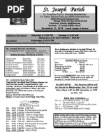 Archdiocese, we ask that you consider making a donation if you have not yet done so envelopes are available in the back of church, or you may make a gift online at [Link]/CSA. Every pledge or gift is appreciated. Religious Education for Children/Youth: Classroom sessions will continue as scheduled this Sunday and again on th the 16 , before we observe our Christmas Season break. Please remember to pray for, and thank, our Catechists, who volunteer each week to share our Catholic faith with young parishioners. Contact Diane Black with any questions. Youth Ministry: Thanks to Cindy Hayes who organized Christmas in Jamaica last Sunday and to those who supported the youths fundraiser a total of $125 was earned to go to their mission work. A reminder that the youth will meet next Sunday as scheduled and should gather in the RE Office at 12:30 PM. Contact Laura Zoeller with any questions. RCIA: Last Sunday, we celebrated the Rite of Acceptance and Welcoming for those in RCIA. Please pray for them throughout their faith journey, along with their sponsors and the RCIA team members. Contact Marilena Wertz at 477-8534 or mlwertz@[Link] if you are interested in joining the Catholic Church, to volunteer, or with questions. Adult Faith Formation: A 10-week study on the Psalms requested by some will begin in January. We will interrupt this study during Lent, when we have Why Catholic? groups and then resume after Easter. We plan to have a group on Thursday evenings, and if there is an interest, another group on Monday morning or afternoon. To order enough study sets, please call or email Deacon Carl, 502-724-9671 or carlfahringer@[Link] if you would like to participate. Advent Charity: All the Angels from our Giving Tree have been selected, and we remind you that you need to th return your wrapped gifts no later than December 15-16 , with each gift labeled with the number. Contact Parish Coordinator Mary Anne Cecil, 477-6035, if you have any questions. You may choose to participate in the Marine Corps Leagues Toys for Tots drive. Please bring a new, unwrapped game or toy to donate the collection boxes are in the Parish Hall and outside the Parish Offices. Bruce Kapfhammer is the contact at 477-2963. Thank you for your help. Christmas Masses: Please note that Christmas Eve Mass is at 4:00 PM and Christmas Day Mass is 9:00 AM. K of C Monthly Chicken Dinner: All are invited for next Sundays meal, from 12:30-2:30 PM in the Parish Hall. Its all you care to eat and includes drink and dessert. Prices: $7.50 for adult; $3.50 for children 4-12; and free for younger. Prayer Garden: Contact Connie Eisenback or David Young with questions, or pick up an informational brochure. Payments for the project are considered purchases, and will not be included in your annual parish contribution amount. Mass Intentions: Contact Diane Black in the Parish Office to schedule a Mass for your intentions. The customary fee is $10, and Masses are scheduled no more than 12 months in advance. There are many Thursday Masses available, and several weekend liturgies remain open it is a prayerful way to remember your loved ones, living and deceased. AA will meet at 7:30 PM this Tuesday in the Parish Hall. An open discussion format is used. Upcoming Events: th Wednesday, December 12 6:30-7:45 PM Holy Hour Rosary, Communion, Benediction Sunday, December 16th 12:30-1:30 PM MS/HS Youth Meeting, Meet in RE Office first 12:30- 2:30 PM K of C Monthly Chicken Dinner, Parish Hall 3:00 PM Advent Reconciliation Service, St. Francis Xavier, MW Communion Ministers: Sat. 12/08 Deacon, Mona Haire, Connie Eisenback Sun. 12/09 Deacon, Lori and David Young Sat. 12/15 Deacon, Becky Hornung, Carolyn Kapfhammer Sun. 12/16 Deacon, Robert and Tina Searcy Servers: Sat. 12/08 Mary Anne Cecil Sun. 12/09 Michael Richards, Matthew Louis Sat. 12/15 Jim Pusey Sun. 12/16 Elijah and Gabriel Rock Ministers to the Sick: December 8-9 Becky Hornung December 15-16 Anna Hochstrasser Ministers of the Word: Sat. 12/08 Mary Akins, Phoebe Brown Sun. 12/09 Robert Searcy, Joe Bowling Sat. 12/15 Mary Anne Cecil, Gerard Hinton Sun. 12/16 Patti Grubb, Diane Black Ministers of Hospitality: Sat. 12/08 Pete Vowels, Tom Burns Sun. 12/09 Darren Esterle, Patti Grubb Sat. 12/15 Tim Gahlinger, Pete Vowels Sun. 12/16 Barbara Yates, John Shirley Reminder: Liturgical Ministers are asked to find a substitute when unable to perform your assigned ministry, and to arrive 15 minutes before Mass.