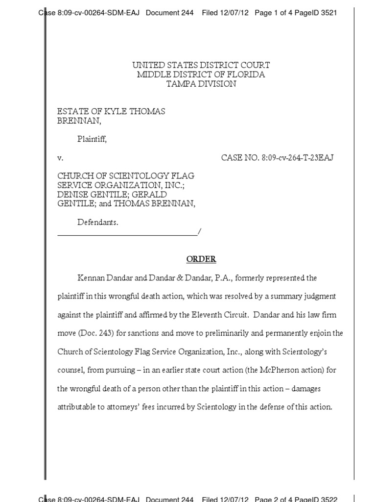 UNITED STATES DISTRICT COURTMIDDLE DISTRICT OF FLORIDATAMPA DIVISIONESTATE OF KYLE THOMASBRENNAN,Plaintiff,v. CASE NO. 8:09-cv-264-T-23EAJCHURCH OF SCIENTOLOGY FLAGSERVICE ORGANIZATION, INC.;DENISE GENTILE; GERALD GENTILE; and THOMAS BRENNAN,Defendants. /