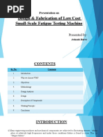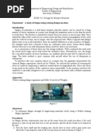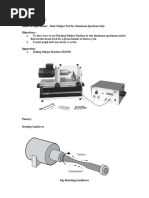 Object: Fatigue bend test of given specimen on fatigue testing machine. Apparatus: Fatigue testing machine, specimen, and vernier caliper. Theory: All metals both ferrous and non-ferrous have fatigue properties that are tendency to breaks when subjected to stress under specific load. If gives the relevant information of the metals fatigue properties, when it is subjected to continuous rotation at a constant speed. Material fail under repeated loading & unloading or under reversed of stress, at stresses smaller than the ultimate strength of the material under static loads. The magnitudes of the stress required producing failure decreases as the number of cycle of stress increases. This phenomenon of the decreased resistance of a material to repeated stresses is called fatigue and the testing of a material by the application of such stresses is called and endurance test. The test consists of mounting a test piece as a cantilever, the test piece is rotated and subjected to a bending moment the test piece is rotated until failure occurs or until a pre-detrained number of stresses cycle has exceeded. Procedure: 1. Place the machine on a solid and leveled surface. 2. Provide 400-440 volts, single-phase, 50 Hz Ac connections from mains. 3. Fix one end of the specimen between the gripping vice on the motor end and secure it tight with the spanner. 4. Fix the other end of the specimen between the gripping vice on the other end secure it tight with spanner. 5. Set the electronic counter to read revolution. 6. Switch on the machine by pressing the push button. 7. With this specimen starts rotating. 8. Gradually add weights on the suspended covers.