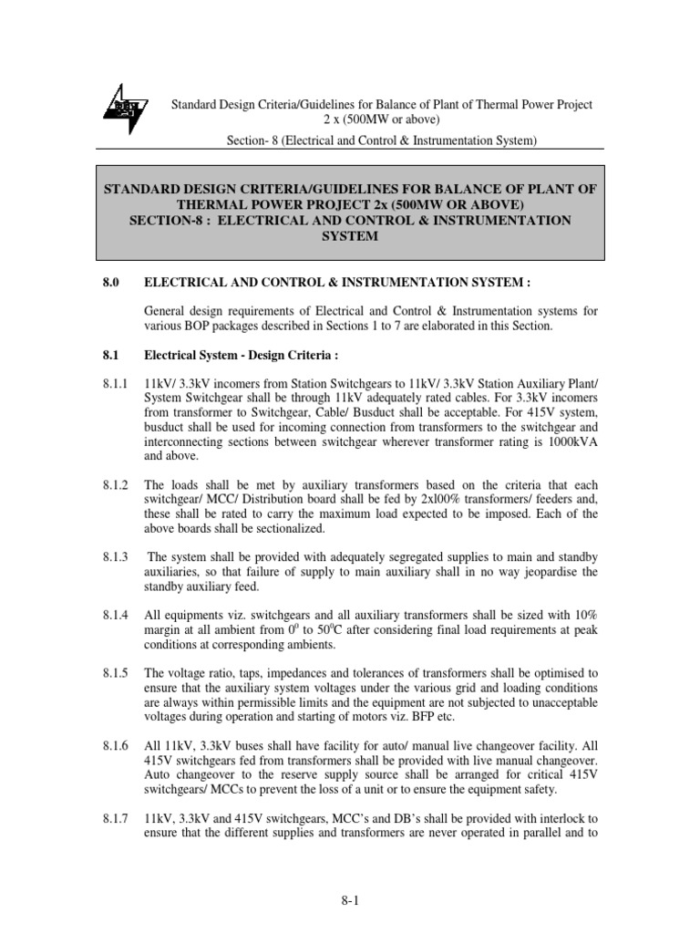 STANDARD DESIGN CRITERIA/GUIDELINES FOR BALANCE OF PLANT OF THERMAL POWER PROJECT 2x (500MW OR ABOVE) SECTION-8 : ELECTRICAL AND CONTROL & INSTRUMENTATION SYSTEM