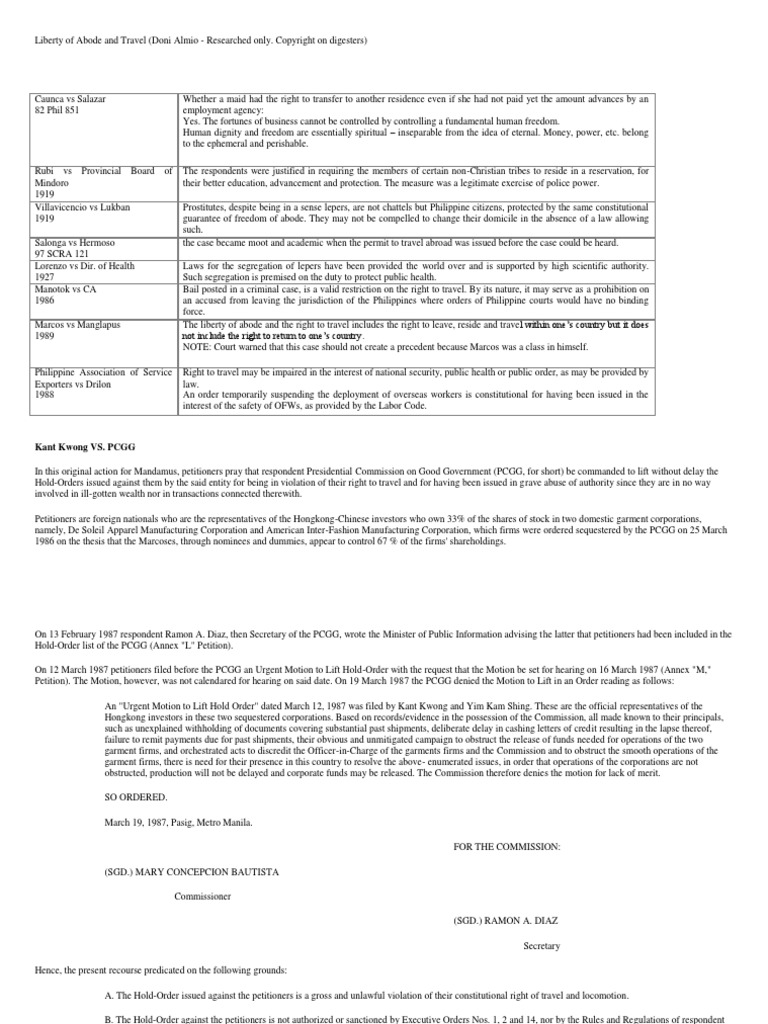 Kant Kwong VS. PCGG In this original action for Mandamus, petitioners pray that respondent Presidential Commission on Good Government (PCGG, for short) be commanded to lift without delay the Hold-Orders issued against them by the said entity for being in violation of their right to travel and for having been issued in grave abuse of authority since they are in no way involved in ill-gotten wealth nor in transactions connected therewith. Petitioners are foreign nationals who are the representatives of the Hongkong-Chinese investors who own 33% of the shares of stock in two domestic garment corporations, namely, De Soleil Apparel Manufacturing Corporation and American Inter-Fashion Manufacturing Corporation, which firms were ordered sequestered by the PCGG on 25 March 1986 on the thesis that the Marcoses, through nominees and dummies, appear to control 67 % of the firms' shareholdings.