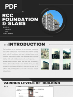 girders, which then transfer the force to adjacent structural compression members. In light frame construction the joists rest on the beam. Beams are characterized by their profile (the shape of their crosssection), their length, and their material. In contemporary construction, beams are typically made of steel, reinforced concrete, wood, composites, or cased fluids (inflatable beams). One of the most common types of steel beam is the I-beam or wide-flange beam (also known as a "universal beam" or, for stouter sections, a "universal column"). This is commonly used in steel-frame buildings and bridges. Other common beam profiles are the C-channel, the hollow structural section beam, the pipe, and the angle. Slab That part of a reinforced concrete floor, roof, or platform which spans beams, columns, walls, or piers. A concrete slab is a common structural element of modern buildings. Horizontal slabs of steel reinforced concrete, typically between 100 and 500 millimeters thick, are most often used to construct floors and ceilings, while thinner slabs are also used for exterior paving. In many domestic and industrial buildings a thick concrete slab, supported on foundations or directly on the subsoil, is used to construct the ground floor of a building. In high rise buildings and skyscrapers, thinner, pre-cast concrete slabs are slung between the steel frames to form the floors and ceilings on each level. On the technical drawings, reinforced concrete slabs are often abbreviated to "r.c.slab" or simply "r.c.". Shallow Foundations Shallow foundations (sometimes called 'spread footings') include pads ('isolated footings'), strip footings and rafts. Shallows foundations are used when surface soils are sufficiently strong and stiff to support the imposed loads; they are generally unsuitable in weak or highly compressible soils, such as poorly-compacted fill, peat, recent lacustrine and alluvial deposits, etc. Pad Foundations Pad foundations are used to support an individual point load such as that due to a structural column. They may be circular, square or reactangular. They usually consist of a block or slab of uniform thickness, but they may be stepped or haunched if they are required to spread the load from a heavy column. Pad foundations are usually shallow, but deep pad foundations can also be used. Strip Foundations Strip foundations are used to support a line of loads, either due to a load-bearing wall, or if a line of columns need supporting where column positions are so close that individual pad foundations would be inappropriate. Raft Foundations Raft foundations are used to spread the load from a structure over a large area, normally the entire area of the structure. They are used when column loads or other structural loads are close together and individual pad foundations would interact. A raft foundation normally consists of a concrete slab which extends over the entire loaded area. It may be stiffened by ribs or beams incorporated into the foundation. Deep Foundations Deep foundations are those founding too deeply below the finished ground surface for their base bearing capacity to be affected by surface conditions, this is usually at depths >3 m below finished ground level. They include piles, piers and caissons or compensated foundations using deep basements and also deep pad or strip foundations. Deep foundations can be used to transfer the loading to a deeper, more competent strata at depth if unsuitable soils are present near the surface.