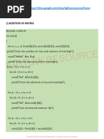 h> main() { int m, n, c, d, first[10][10], second[10][10], sum[10][10]; printf("Enter the number of rows and columns of matrix "); scanf("%d%d", &m, &n); printf("Enter the elements of first matrix\n"); for ( c = 0 ; c < m ; c++ ) for ( d = 0 ; d < n ; d++ ) scanf("%d", &first[c][d]); printf("Enter the elements of second matrix\n"); for ( c = 0 ; c < m ; c++ ) for ( d = 0 ; d < n ; d++ ) scanf("%d", &second[c][d]); for ( c = 0 ; c < m ; c++ ) for ( d = 0 ; d < n ; d++ ) sum[c][d] = first[c][d] + second[c][d]; printf("Sum of entered matrices:-\n"); for ( c = 0 ; c < m ; c++ ) { for ( d = 0 ; d < n ; d++ ) printf("%d\t", sum[c][d]); printf("\n"); } return 0; }