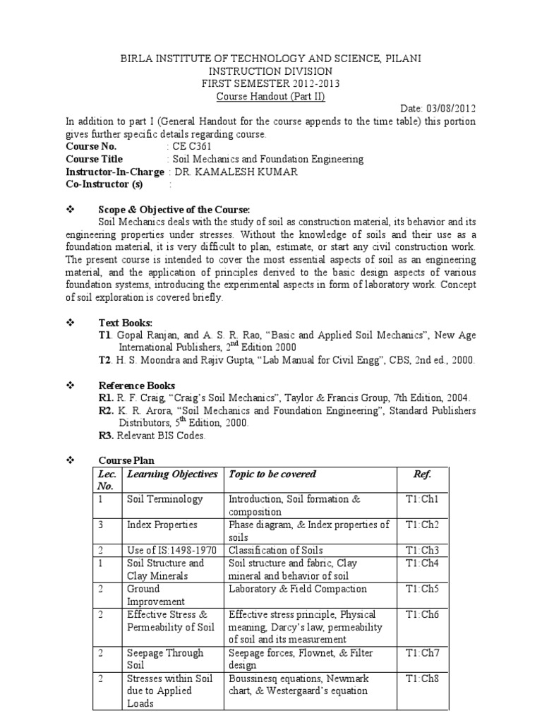 Date: 03/08/2012 In addition to part I (General Handout for the course appends to the time table) this portion gives further specific details regarding course. Course No. : CE C361 Course Title : Soil Mechanics and Foundation Engineering Instructor-In-Charge : DR. KAMALESH KUMAR Co-Instructor (s) : Scope & Objective of the Course: Soil Mechanics deals with the study of soil as construction material, its behavior and its engineering properties under stresses. Without the knowledge of soils and their use as a foundation material, it is very difficult to plan, estimate, or start any civil construction work. The present course is intended to cover the most essential aspects of soil as an engineering material, and the application of principles derived to the basic design aspects of various foundation systems, introducing the experimental aspects in form of laboratory work. Concept of soil exploration is covered briefly. Text Books: T1. Gopal Ranjan, and A. S. R. Rao, Basic and Applied Soil Mechanics, New Age International Publishers, 2nd Edition 2000 T2. H. S. Moondra and Rajiv Gupta, Lab Manual for Civil Engg, CBS, 2nd ed., 2000. Reference Books R1. R. F. Craig, Craigs Soil Mechanics, Taylor & Francis Group, 7th Edition, 2004. R2. K. R. Arora, Soil Mechanics and Foundation Engineering, Standard Publishers Distributors, 5th Edition, 2000. R3. Relevant BIS Codes. Course Plan Lec. Learning Objectives No. 1 Soil Terminology 3 2 1 2 2 2 2 Index Properties Use of IS:1498-1970 Soil Structure and Clay Minerals Ground Improvement Effective Stress & Permeability of Soil Seepage Through Soil Stresses within Soil due to Applied Loads Topic to be covered Introduction, Soil formation & composition Phase diagram, & Index properties of soils Classification of Soils Soil structure and fabric, Clay mineral and behavior of soil Laboratory & Field Compaction Effective stress principle, Physical meaning, Darcys law, permeability of soil and its measurement Seepage forces, Flownet, & Filter design Boussinesq equations, Newmark chart, & Westergaards equation Ref. T1:Ch1 T1:Ch2 T1:Ch3 T1:Ch4 T1:Ch5 T1:Ch6 T1:Ch7 T1:Ch8