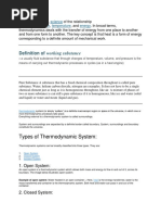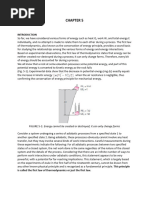 2 Note that internal energy is a function of state. This means, for example in the case of a gas, whose state is determined by its pressure, volume and temperature, that the internal energy is uniquely determined (apart from an arbitrary constant) by P, V and T i.e. by the state of the gas. It also means that in going from one state to another (i.e. from one point in PVT space to another), the change in the internal energy is route-independent. The internal energy may be changed by performance of work or by addition of heat, or some combination of each, but, whatever combination of work and energy is added, the change in internal energy depends only upon the initial and final states. This means, mathematically, that dU is an exact differential (see Chapter 2, Section 2.1). The differentials dQ and dW, however, are not exact differentials. Note that if work is done on a Body by forces in the Rest of the Universe, and heat is transferred to the Body from the Rest of the Universe (also known as the Surroundings of the Body), the internal energy of the Body increases by dQ + dW , while the internal energy of the Rest of the Universe (the Surroundings) decreases by the same amount. Thus the internal energy of the Universe is constant. This is an equivalent statement of the First Law. It is also sometimes stated as Energy can neither be created nor destroyed. 7.2
