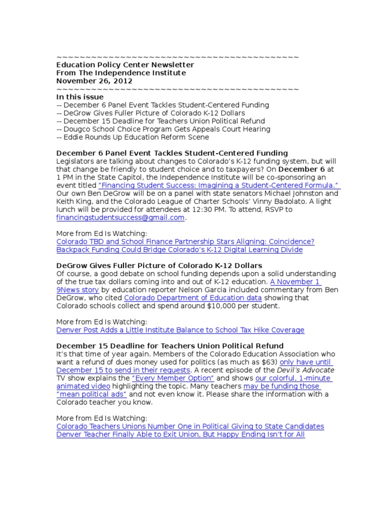 -- December 6 Panel Event Tackles Student-Centered Funding -- DeGrow Gives Fuller Picture of Colorado K-12 Dollars -- December 15 Deadline for Teachers Union Political Refund -- Dougco School Choice Program Gets Appeals Court Hearing -- Eddie Rounds Up Education Reform Scene December 6 Panel Event Tackles Student-Centered Funding Legislators are talking about changes to Colorados K-12 funding system, but will that change be friendly to student choice and to taxpayers? On December 6 at 1 PM in the State Capitol, the Independence Institute will be co-sponsoring an event titled Financing Student Success: Imagining a Student-Centered Formula. Our own Ben DeGrow will be on a panel with state senators Michael Johnston and Keith King, and the Colorado League of Charter Schools Vinny Badolato. A light lunch will be provided for attendees at 12:30 PM. To attend, RSVP to financingstudentsuccess@gmail.com. More from Ed Is Watching: Colorado TBD and School Finance Partnership Stars Aligning: Coincidence? Backpack Funding Could Bridge Colorados K-12 Digital Learning Divide DeGrow Gives Fuller Picture of Colorado K-12 Dollars Of course, a good debate on school funding depends upon a solid understanding of the true tax dollars coming into and out of K-12 education. A November 1 9News story by education reporter Nelson Garcia included commentary from Ben DeGrow, who cited Colorado Department of Education data showing that Colorado schools collect and spend around $10,000 per student. More from Ed Is Watching: Denver Post Adds a Little Institute Balance to School Tax Hike Coverage December 15 Deadline for Teachers Union Political Refund Its that time of year again. Members of the Colorado Education Association who want a refund of dues money used for politics (as much as $63) only have until December 15 to send in their requests. A recent episode of the Devils Advocate TV show explains the Every Member Option and shows our colorful, 1-minute animated video highlighting the topic. Many teachers may be funding those mean political ads and not even know it. Please share the information with a Colorado teacher you know. More from Ed Is Watching: Colorado Teachers Unions Number One in Political Giving to State Candidates Denver Teacher Finally Able to Exit Union, But Happy Ending Isnt for All