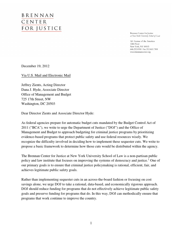Hyde, Associate Director Office of Management and Budget 725 17th Street, NW Washington, DC 20503 Dear Director Zients and Associate Director Hyde: As federal agencies prepare for automatic budget cuts mandated by the Budget Control Act of 2011 (BCA), we write to urge the Department of Justice (DOJ) and the Office of Management and Budget to approach budgeting for criminal justice programs by prioritizing evidence-based programs that protect public safety and use federal resources wisely. We recognize the difficulty involved in deciding how to implement these sequester cuts. We write to propose a basic framework to determine how those cuts would be distributed within the agency. The Brennan Center for Justice at New York University School of Law is a non-partisan public policy and law institute that focuses on improving the systems of democracy and justice. 1 One of our primary goals is to ensure that criminal justice policymaking is rational, efficient, fair, and achieves legitimate public safety goals. Rather than implementing sequester cuts in an across-the-board fashion or focusing on cost savings alone, we urge DOJ to take a rational, data-based, and economically rigorous approach. DOJ should reduce funding for programs that do not effectively achieve legitimate public safety goals and preserve funding for programs that do. In this way, DOJ can methodically ensure that programs that work continue to improve the country.