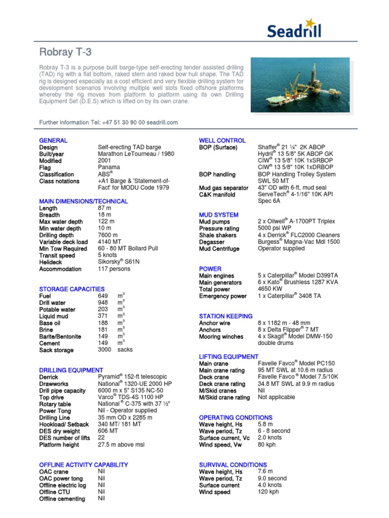 Robray T-3 is a purpose built barge-type self-erecting tender assisted drilling (TAD) rig with a flat bottom, raked stern and raked bow hull shape. The TAD rig is designed especially as a cost efficient and very flexible drilling system for development scenarios involving multiple well slots fixed offshore platforms whereby the rig moves from platform to platform using its own Drilling Equipment Set (D.E.S) which is lifted on by its own crane.