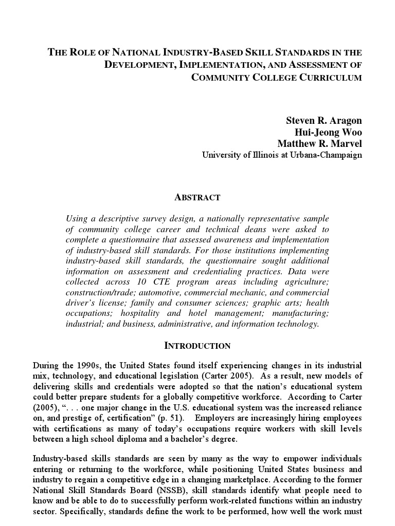 Aragon, S. R., Woo, H., & Marvel, M. R. (2004). Analysis of the integration of skill standards into community college curriculum. Minneapolis: National Research Center for Career and Technical Education, University of Minnesota. Bailey, T. (1997). Integrating academic and industry skill standards. Berkeley, CA: National Center for Research in Vocational Education. (No. MDS-1001) Bailey, T., & Merritt, D. (1995). Making sense of industry-based skill standards. Berkeley, CA: National Center for Research in Vocational Education. (MDS-777) Boesel, D., Rahn, M., & Diech, S. (1994). National Assessment of Vocational Education. Final Report to Congress 3. Program improvement: Education reform (Report No. OR-94-3502-III). Washington, D.D. (ERIC Document Reproduction Service No. ED371193) Bunn, P., & Stewart, D. (1998). Perceptions of technical committee members regarding the adoption of skill standards in vocational education programs. Journal of Career and Technical Education, 14, 717.