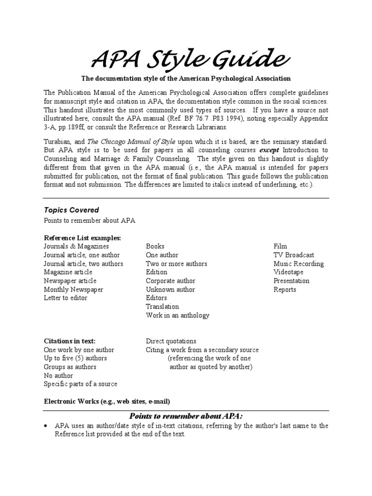 complete guidelines for manuscript style and citation in APA, the documentation style common in the social sciences. This handout illustrates the most commonly used types of sources. If you have a source not illustrated here, consult the APA manual (Ref. BF 76.7 .P83 1994), noting especially Appendix 3-A, pp.189ff, or consult the Reference or Research Librarians. Turabian, and The Chicago Manual of Style upon which it is based, are the seminary standard. But APA style is to be used for papers in all counseling courses except Introduction to Counseling and Marriage & Family Counseling. The style given on this handout is slightly different from that given in the APA manual (i.e., the APA manual is intended for papers submitted for publication, not the format of final publication. This guide follows the publication format and not submission. The differences are limited to italics instead of underlining, etc.). Topics Covered Points to remember about APA Reference List examples: Journals & Magazines Journal article, one author Journal article, two authors Magazine article Newspaper article Monthly Newspaper Letter to editor Books One author Two or more authors Edition Corporate author Unknown author Editors Translation Work in an anthology Direct quotations Citing a work from a secondary source (referencing the work of one author as quoted by another) Film TV Broadcast Music Recording Videotape Presentation Reports