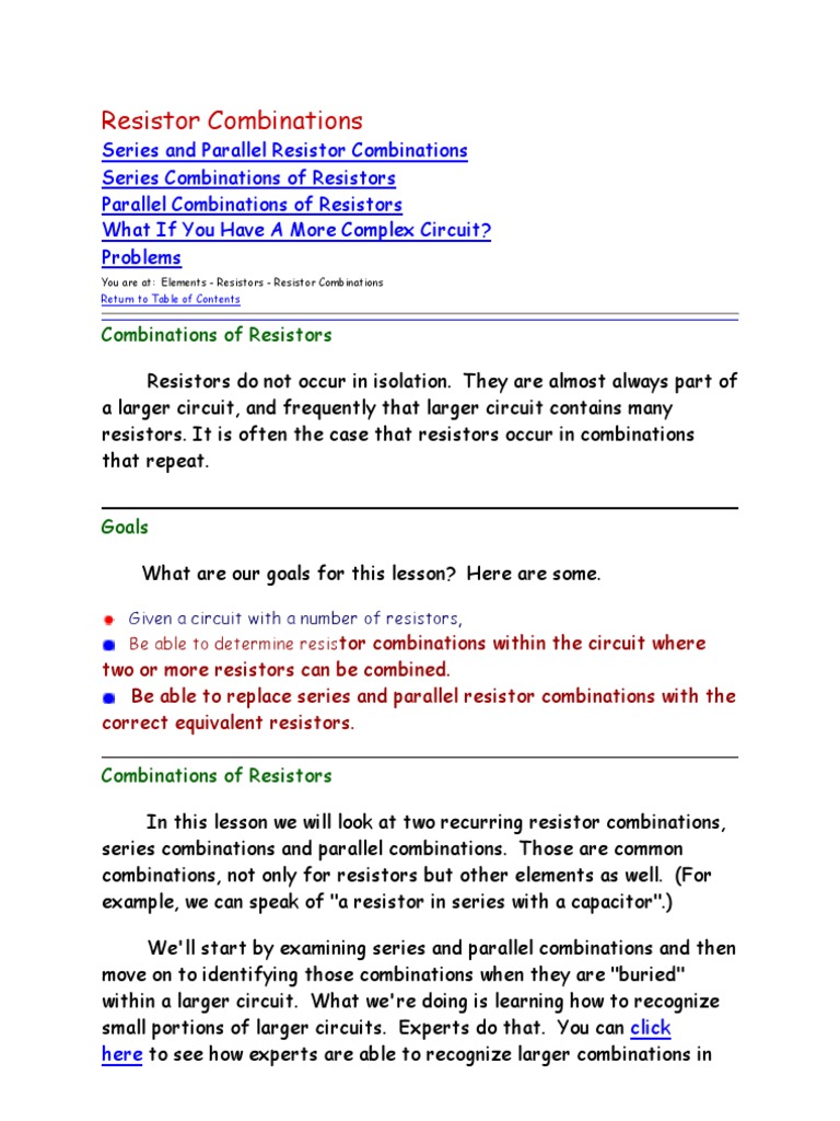 two or more resistors can be combined. Be able to replace series and parallel resistor combinations with the correct equivalent resistors. Combinations of Resistors In this lesson we will look at two recurring resistor combinations, series combinations and parallel combinations. Those are common combinations, not only for resistors but other elements as well. (For example, we can speak of "a resistor in series with a capacitor".) We'll start by examining series and parallel combinations and then move on to identifying those combinations when they are "buried" within a larger circuit. What we're doing is learning how to recognize small portions of larger circuits. Experts do that. You can click here to see how experts are able to recognize larger combinations in