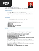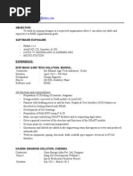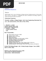 Career Objective: Looking for a right position in a growth oriented organization where I can use my technical as well as management skills and give my best of personal strength. Total Experience: 5 years in Process, Oil & Gas, Refineries, Power & Engineering industries etc. Knowledge of: - Piping codes & standards. - PFD and P&ID. - GAD. - Plot plan. - Process plant layout. - Piping Welding, Erection & Testing. Familiar with - International Piping Design codes & Dimensional standards. -Such as ANSI/ASME, API, BS, ASTM & there use in design and calculation. Software Exposure: 1 PDMS 2 Microstation 7.1& V8i 3 Auto CAD 4 Navigator-V8i 5 Navisworks Work experience: 1) CITEC ENGINEERING INDIA PVT. LTD. (Mumbai) Project Client Software Designation Duration Job Responsibility: Preparation of piping layout. Preparation of equipment layout. Preparation of GAD as per P&IDs. Preparation of line list. Draft module. 2) UDHE INDIA PVT. LTD. (Mumbai) Project Client Software Designation Duration Job Responsibility: Project Client Software Designation Duration Preparation of piping Layout. Preparation of GAD as per P&IDs. Equipment modeling. Draft module. : : : : : NGL-I, NGL-2, NGL-3 & NGL-4/PS-1, PS-2, PS-3/Terminals/Tankfarm Qatar Petroleum. PDMS, AutoCAD, Mocrostation, Navigator & Naviswork. Piping Designer From April 2010 to Jan 2011 : : : : : DAP/NPK Plant (Train-C) Project. Coromandel International Ltd Kakinada A.P PDMS, AutoCAD & Naviswork. Piping Designer From March 2011 to September 2011 : : : : : Los Origense Extension Project Wartsila PDMS & Auto CAD Piping Designer From October 2011 to till date