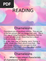 madeit unique. Themost remarkablefeature of is chameleons their ability to changecolour,an ability rivalled only by cuttlefish and octopi in of the animal kingdom. Because this, colour is apart not the best thing for telling chameleons are and different species usuallyidentified based on the patterning and shapeof the head,and In the arrangementof scales. this caseit was the nose. on bulge of scales the chameleon's Chameleons ableto use colour for both are by communicationand camouflage switching from bright, showy colours to the exact Theyshow an colour of a twig within seconds. extraordinaty tange of colours, from nearly black pinks and greens,even to bright blues,oranges, severalat once.A popular misconceptionis that can chameleons match whateverbackground red they are placedon, whether a chequered and yellow shirt or a Smartie* box. But each set has species a characteristic of cellscontaining pigment distributed over their bodiesin a specificpattern, which determinesthe range of coloursand patterns they can show.To the great disappointmentof many children,placing a chameleonon a Smartiebox generallyresults confused,dark gteyor mottled in a stressed, chameleon. are Chameleons visual animalswith excellent eyesight,and they communicatewith colour. encounter When two male dwarf chameleons
