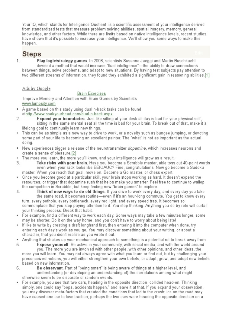 Brain Exercises Improve Memory and Attention with Brain Games by Scientists www.lumosity.com A game based on this study using dual n-back tasks can be found athttp://www.soakyourhead.com/dual-n-back.aspx. Expand your boundaries. Just like sitting at your desk all day is bad for your physical self, 2 sitting in the same mental seat all the time is bad for your brain. To break out of that, make it a lifelong goal to continually learn new things. This can be as simple as a new way to drive to work, or a novelty such as bungee jumping, or devoting some part of your life to becoming an excellent painter. The "what" is not as important as the actual doing. New experiences trigger a release of the neurotransmitter dopamine, which increases neurons and create a sense of pleasure.[2] The more you learn, the more you'll know, and your intelligence will grow as a result. Take risks with your brain. Have you become a Scrabble master, able toss out 40-point words 3 even when your rack looks like EEIOAUC? Fine, congratulations. Now go become a Sudoku master. When you reach that goal, move on. Become a Go master, or chess expert. Once you become good at a particular skill, your brain stops working as hard. It doesn't expend the resources, or trigger that dopamine rush that helps make you smarter. Feel free to continue to wallop the competition in Scrabble, but keep finding new "brain games" to explore. Think of new ways to do old things. If you drive to work every day, and every day you take 4 the same road, it becomes routineeven if it's an hour-long commute. You get to know every turn, every pothole, every bottleneck, every red light, and every speed trap. It becomes so commonplace that you stop paying attention to it. You stop thinking. Anything you do by rote will curtail your thinking process. Break that habit. For example, find a different way to work each day. Some ways may take a few minutes longer, some may be shorter. Do it on the way home, and you don't have to worry about being late! If like to write by creating a draft longhand first, then entering it into the computer when done, try entering each day's work as you go. You may discover something about your writing, or about a character, that you didn't realize as you wrote it out. Anything that shakes up your mechanical approach to something is a potential rut to break away from. Expose yourself. Be active in your community, with social media, and with the world around 5 you. The more you are involved with other people, with other opinions, and other ideas, the more you will learn. You may not always agree with what you learn or find out, but by challenging your preconceived notions, you will either strengthen your own beliefs, or adapt, grow, and adopt new beliefs based on new information. Be observant. Part of "being smart" is being aware of things at a higher level, and 6 understanding (or developing an understanding of) the correlations among what might otherwise seem to be disparate or random events. For example, you see that two cars, heading in the opposite direction, collided head-on. Thinking simply, one could say "oops, accidents happen," and leave it at that. If you expand your observation, you may discover meta-factors that created the conditions that led to the crash: ice on the road may have caused one car to lose traction; perhaps the two cars were heading the opposite direction on a