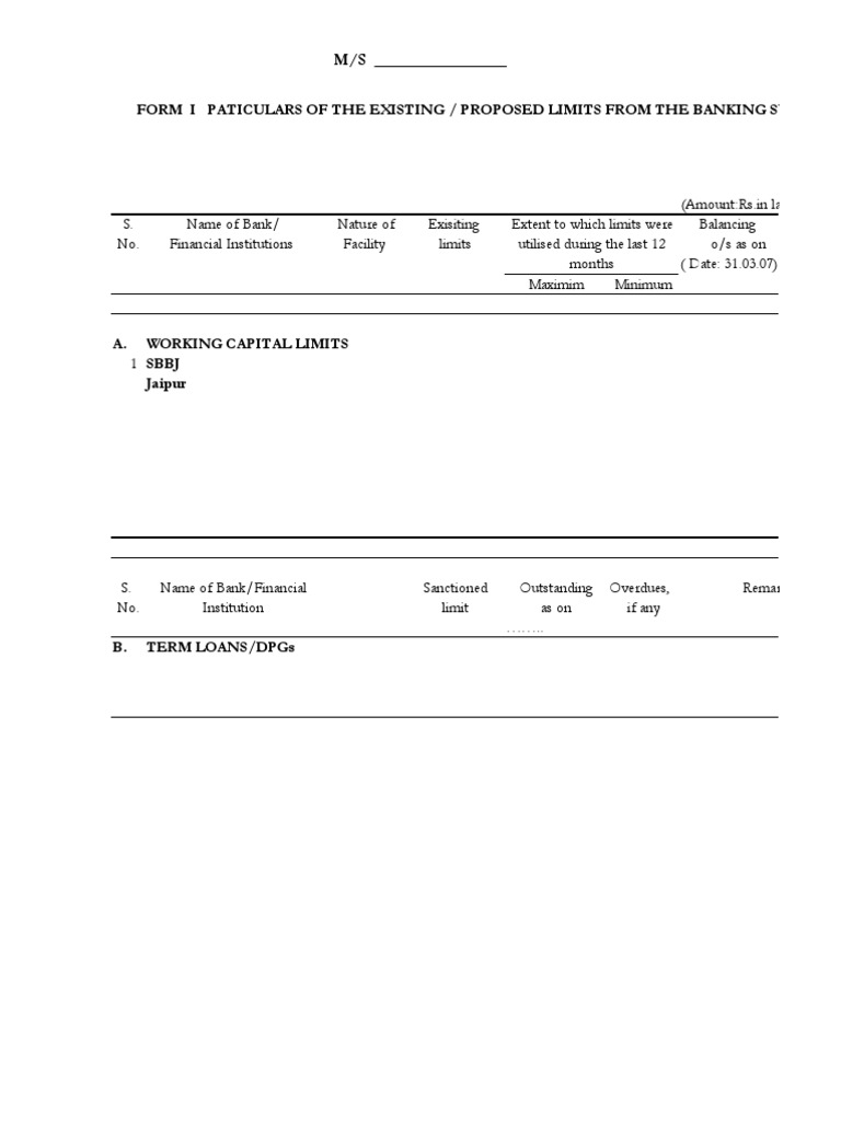FORM I PATICULARS OF THE EXISTING / PROPOSED LIMITS FROM THE BANKING SYSTEM