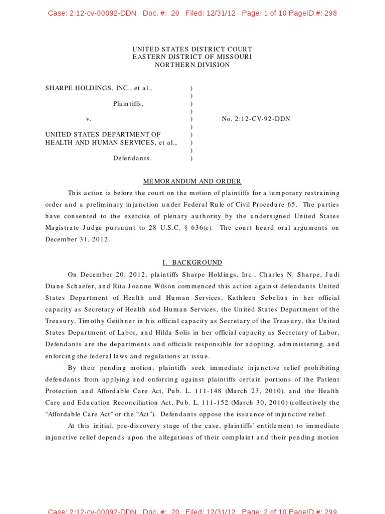 On December 20, 2012, plaintiffs Sharpe Holdings, Inc., Charles N. Sharpe, JudiDiane Schaefer, and Rita Joanne Wilson commenced this action against defendants UnitedStates Department of Health and Human Services, Kathleen Sebelius in her officialcapacity as Secretary of Health and Human Services, the United States Department of theTreasury, Timothy Geithner in his official capacity as Secretary of the Treasury, the UnitedStates Department of Labor, and Hilda Solis in her official capacity as Secretary of Labor.Defendants are the departments and officials responsible for adopting, administering, andenforcing the federal laws and regulations at issue.By their pending motion, plaintiffs seek immediate injunctive relief prohibitingdefendants from applying and enforcing against plaintiffs certain portions of the PatientProtection and Affordable Care Act, Pub. L. 111-148 (March 23, 2010), and the HealthCare and Education Reconciliation Act, Pub. L. 111-152 (March 30, 2010) (collectively the“Affordable Care Act” or the “Act”). Defendants oppose the issuance of injunctive relief.At this initial, pre-discovery stage of the case, plaintiffs’ entitlement to immediateinjunctive relief depends upon the allegations of their complaint and their pending motion