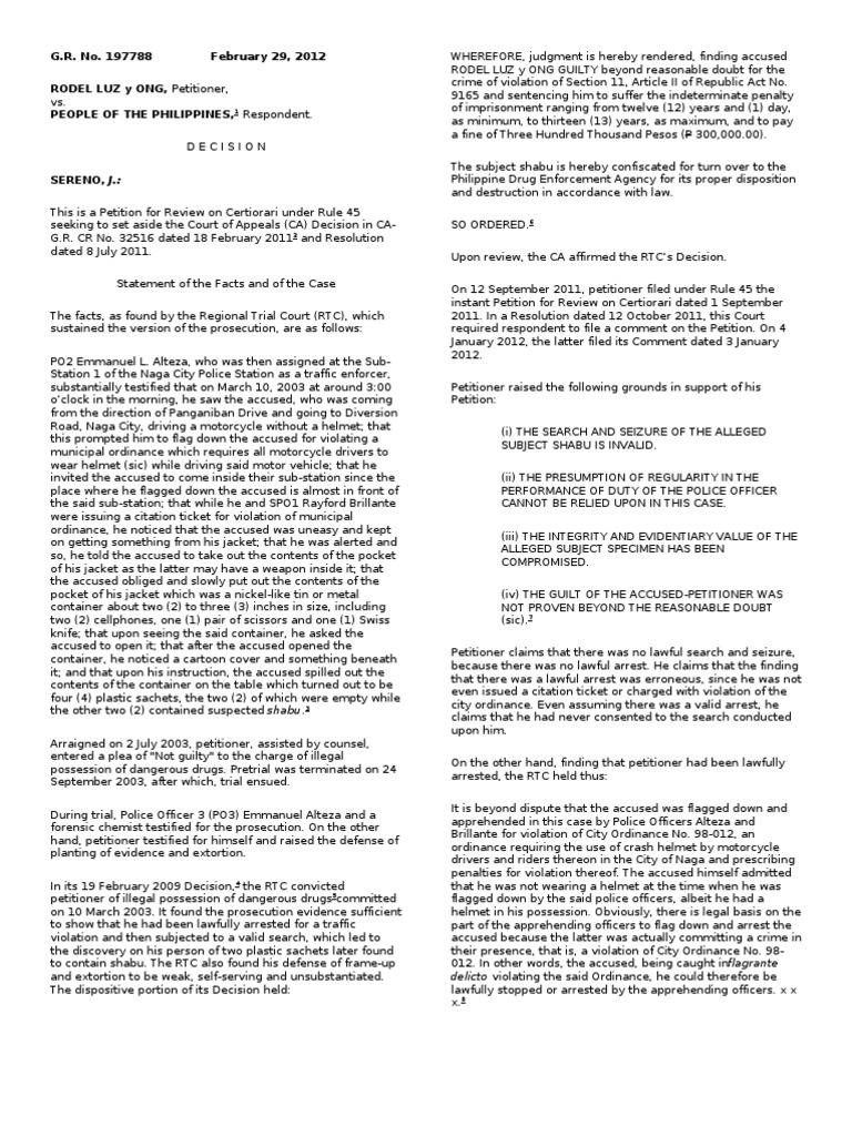 WHEREFORE, judgment is hereby rendered, finding accused RODEL LUZ y ONG GUILTY beyond reasonable doubt for the crime of violation of Section 11, Article II of Republic Act No. 9165 and sentencing him to suffer the indeterminate penalty of imprisonment ranging from twelve (12) years and (1) day, as minimum, to thirteen (13) years, as maximum, and to pay a fine of Three Hundred Thousand Pesos (P 300,000.00). The subject shabu is hereby confiscated for turn over to the Philippine Drug Enforcement Agency for its proper disposition and destruction in accordance with law. SO ORDERED.6 Upon review, the CA affirmed the RTCs Decision. On 12 September 2011, petitioner filed under Rule 45 the instant Petition for Review on Certiorari dated 1 September 2011. In a Resolution dated 12 October 2011, this Court required respondent to file a comment on the Petition. On 4 January 2012, the latter filed its Comment dated 3 January 2012. Petitioner raised the following grounds in support of his Petition: (i) THE SEARCH AND SEIZURE OF THE ALLEGED SUBJECT SHABU IS INVALID. (ii) THE PRESUMPTION OF REGULARITY IN THE PERFORMANCE OF DUTY OF THE POLICE OFFICER CANNOT BE RELIED UPON IN THIS CASE. (iii) THE INTEGRITY AND EVIDENTIARY VALUE OF THE ALLEGED SUBJECT SPECIMEN HAS BEEN COMPROMISED. (iv) THE GUILT OF THE ACCUSED-PETITIONER WAS NOT PROVEN BEYOND THE REASONABLE DOUBT (sic).7 Petitioner claims that there was no lawful search and seizure, because there was no lawful arrest. He claims that the finding that there was a lawful arrest was erroneous, since he was not even issued a citation ticket or charged with violation of the city ordinance. Even assuming there was a valid arrest, he claims that he had never consented to the search conducted upon him. On the other hand, finding that petitioner had been lawfully arrested, the RTC held thus: It is beyond dispute that the accused was flagged down and apprehended in this case by Police Officers Alteza and Brillante for violation of City Ordinance No. 98-012, an ordinance requiring the use of crash helmet by motorcycle drivers and riders thereon in the City of Naga and prescribing penalties for violation thereof. The accused himself admitted that he was not wearing a helmet at the time when he was flagged down by the said police officers, albeit he had a helmet in his possession. Obviously, there is legal basis on the part of the apprehending officers to flag down and arrest the accused because the latter was actually committing a crime in their presence, that is, a violation of City Ordinance No. 98012. In other words, the accused, being caught inflagrante delicto violating the said Ordinance, he could therefore be lawfully stopped or arrested by the apprehending officers. x x x.8