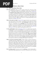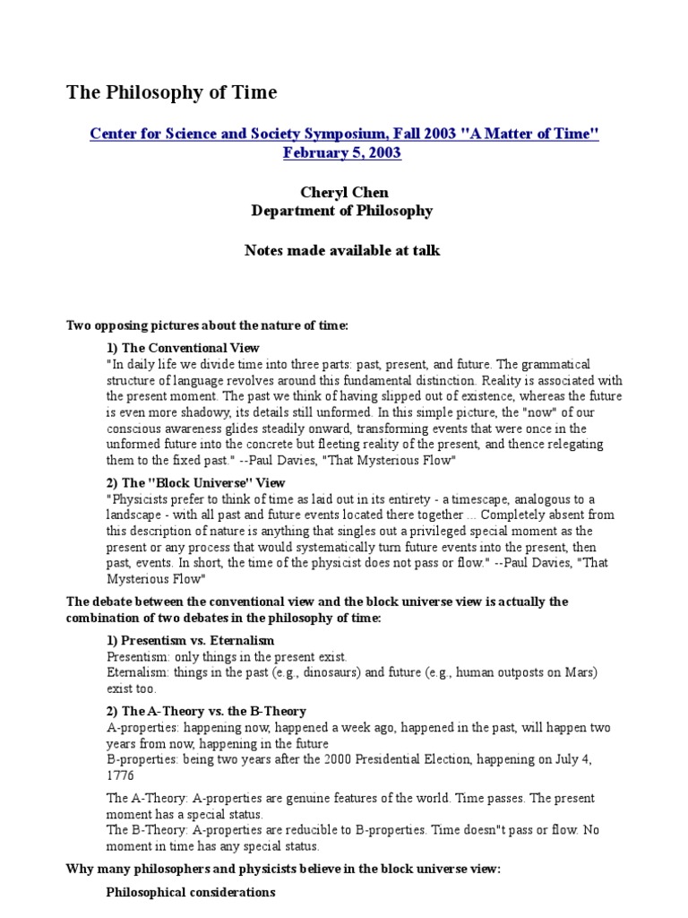 Two opposing pictures about the nature of time: 1) The Conventional View "In daily life we divide time into three parts: past, present, and future. The grammatical structure of language revolves around this fundamental distinction. Reality is associated with the present moment. The past we think of having slipped out of existence, whereas the future is even more shadowy, its details still unformed. In this simple picture, the "now" of our conscious awareness glides steadily onward, transforming events that were once in the unformed future into the concrete but fleeting reality of the present, and thence relegating them to the fixed past." --Paul Davies, "That Mysterious Flow" 2) The "Block Universe" View "Physicists prefer to think of time as laid out in its entirety - a timescape, analogous to a landscape - with all past and future events located there together ... Completely absent from this description of nature is anything that singles out a privileged special moment as the present or any process that would systematically turn future events into the present, then past, events. In short, the time of the physicist does not pass or flow." --Paul Davies, "That Mysterious Flow" The debate between the conventional view and the block universe view is actually the combination of two debates in the philosophy of time: 1) Presentism vs. Eternalism Presentism: only things in the present exist. Eternalism: things in the past (e.g., dinosaurs) and future (e.g., human outposts on Mars) exist too. 2) The A-Theory vs. the B-Theory A-properties: happening now, happened a week ago, happened in the past, will happen two years from now, happening in the future B-properties: being two years after the 2000 Presidential Election, happening on July 4, 1776 The A-Theory: A-properties are genuine features of the world. Time passes. The present moment has a special status. The B-Theory: A-properties are reducible to B-properties. Time doesn"t pass or flow. No moment in time has any special status. Why many philosophers and physicists believe in the block universe view: Philosophical considerations