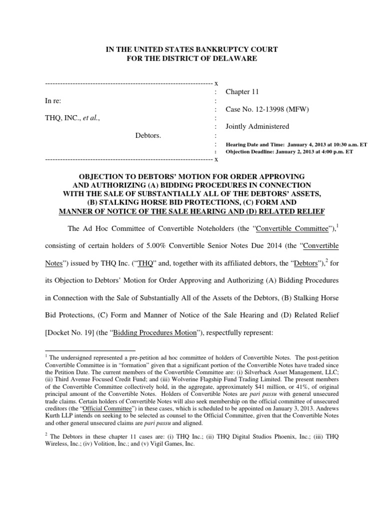 consisting of certain holders of 5.00% Convertible Senior Notes Due 2014 (the “ConvertibleNotes”) issued by THQ Inc. (“THQ” and, together with its affiliated debtors, the “Debtors”),