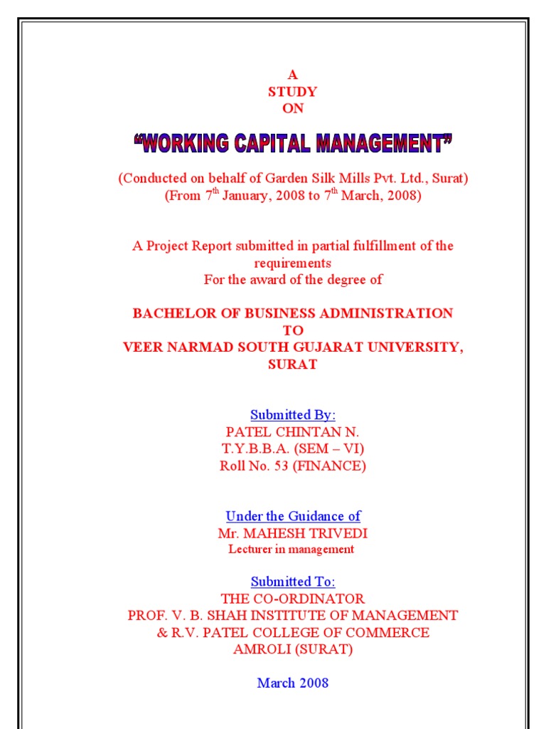 This is to certify that the Project Report entitled A STUDY ON WORKING CAPITAL MANAGEMENT (Conducted on behalf of GARDEN SILK MILLS, SURAT) Submitted in partial fulfillment of the requirement for the award of the degree of BACHELORE OF BUSINESS ADMINISTRATION to VEER NARMAD SOUTH GUJRAT UNIVERSITY, SURAT is a record of bonafide research work carried out by Chinatn N. Patel under my supervision and guidance.