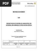 The Inspector shall inspect visually over 100% of the wrapped area. The Inspector shall use a window-type patch test of the tape to pipe adhesion. 12.3.2.1 12.3.2.2 Frequency of the test shall be at the Inspector's discretion. The test shall not be made sooner than 30 minutes after the tape has been applied. The test is acceptable if the plastic outer wrap peels off and the adhesive covers the pipe, or if strings of adhesive expose as the tape peels while the pipe shows all areas covered with adhesion. 12.3.2.4 In the event of a failure, additional window tests shall be made until bonding is acceptable. All the defective areas shall be cleaned to bare steel and rewrapped.