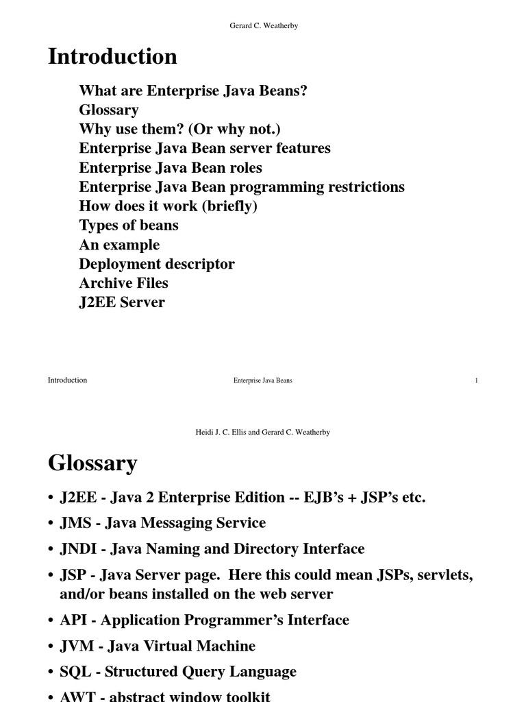 What are Enterprise Java Beans? Glossary Why use them? (Or why not.) Enterprise Java Bean server features Enterprise Java Bean roles Enterprise Java Bean programming restrictions How does it work (briefly) Types of beans An example Deployment descriptor Archive Files J2EE Server