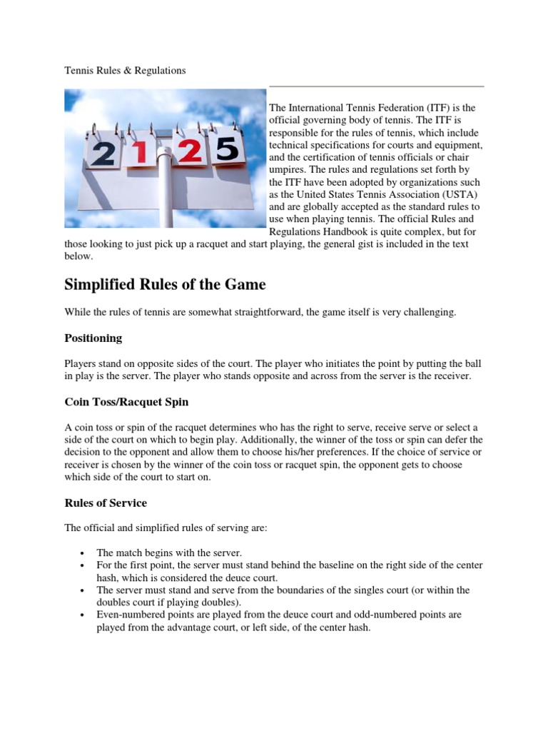 The International Tennis Federation (ITF) is the official governing body of tennis. The ITF is responsible for the rules of tennis, which include technical specifications for courts and equipment, and the certification of tennis officials or chair umpires. The rules and regulations set forth by the ITF have been adopted by organizations such as the United States Tennis Association (USTA) and are globally accepted as the standard rules to use when playing tennis. The official Rules and Regulations Handbook is quite complex, but for those looking to just pick up a racquet and start playing, the general gist is included in the text below.