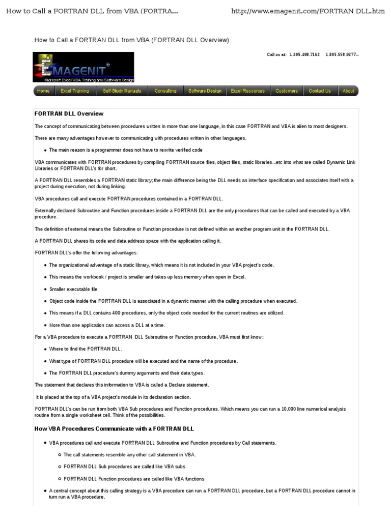 The concept of communicating between procedures written in more than one language, in this case FORTRAN and VBA is alien to most designers. There are many advantages however to communicating with procedures written in other languages. The main reason is a programmer does not have to rewrite verified code VBA communicates with FORTRAN procedures by compiling FORTRAN source files, object files, static libraries...etc into what are called Dynamic Link Libraries or FORTRAN DLLs for short. A FORTRAN DLL resembles a FORTRAN static library; the main difference being the DLL needs an interface specification and associates itself with a project during execution, not during linking. VBA procedures call and execute FORTRAN procedures contained in a FORTRAN DLL. Externally declared Subroutine and Function procedures inside a FORTRAN DLL are the only procedures that can be called and executed by a VBA procedure. The definition of external means the Subroutine or Function procedure is not defined within an another program unit in the FORTRAN DLL. A FORTRAN DLL shares its code and data address space with the application calling it. FORTRAN DLL's offer the following advantages: The organizational advantage of a static library, which means it is not included in your VBA projects code. This means the workbook / project is smaller and takes up less memory when open in Excel. Smaller executable file Object code inside the FORTRAN DLL is associated in a dynamic manner with the calling procedure when executed. This means if a DLL contains 400 procedures, only the object code needed for the current routines are utilized. More than one application can access a DLL at a time. For a VBA procedure to execute a FORTRAN DLL Subroutine or Function procedure, VBA must first know: Where to find the FORTRAN DLL. What type of FORTRAN DLL procedure will be executed and the name of the procedure. The FORTRAN DLL procedures dummy arguments and their data types. The statement that declares this information to VBA is called a Declare statement. It is placed at the top of a VBA projects module in its declaration section. FORTRAN DLL's can be run from both VBA Sub procedures and Function procedures. Which means you can run a 10,000 line numerical analysis routine from a single worksheet cell. Think of the possibilities.